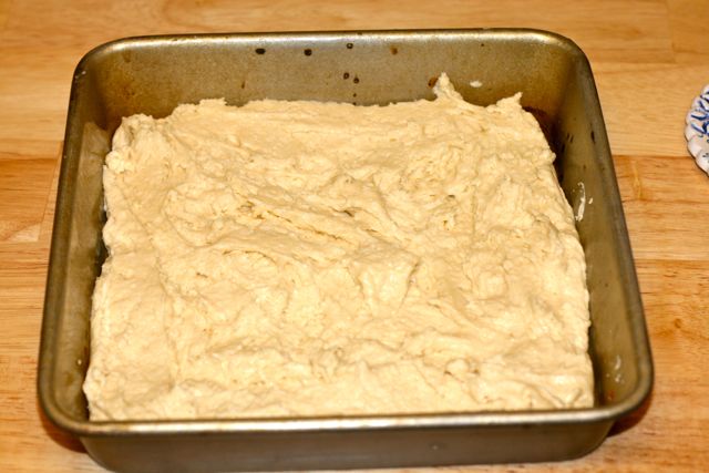 I used Crisco shortening since I happened to have it on hand. I mixed together all the dry ingredients for the cake and then added in the egg and shortening. I didn’t cream them, but it could be done if desired. This mixture I put into an 8×8 pan. It is a very thick and sticky batter that I had some annoying moments of it sticking to my spoon I was using, having to go back and mush it down into the corners, sticking, mushing, etc.