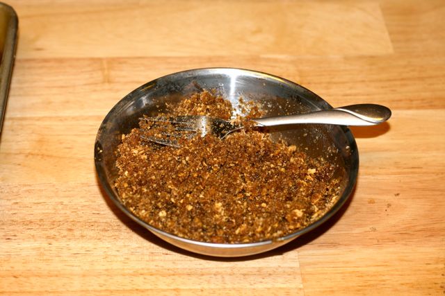 Next I made the topping. For the topping I wound up using 5 tbsp of butter instead of 4 because I can’t count well when I’m distracted by a three year old. I rolled the graham crackers into small pieces, mixed in the cinnamon and brown sugar, then poured in the melted butter. I used a fork to work the butter through the dry ingredients. Don’t use a bowl this small. The next size up would have been better. I spread this evenly over the cake.