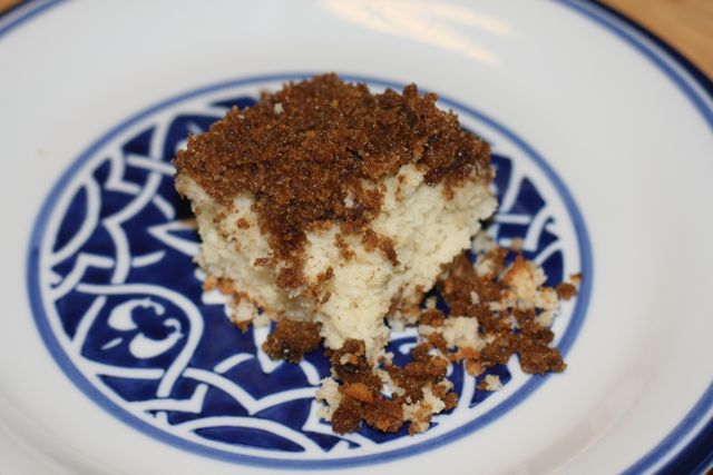 The resulting cake is not terribly sweet but the topping more than makes up for it. It is a medium texture cake, not dense and not fluffy. It was a little crumbly. What I like is that the topping isn’t so loaded with sugar that it scrapes against your teeth when you bite into it. It really does melt in your mouth. With coffee on a Saturday morning, this was divine!