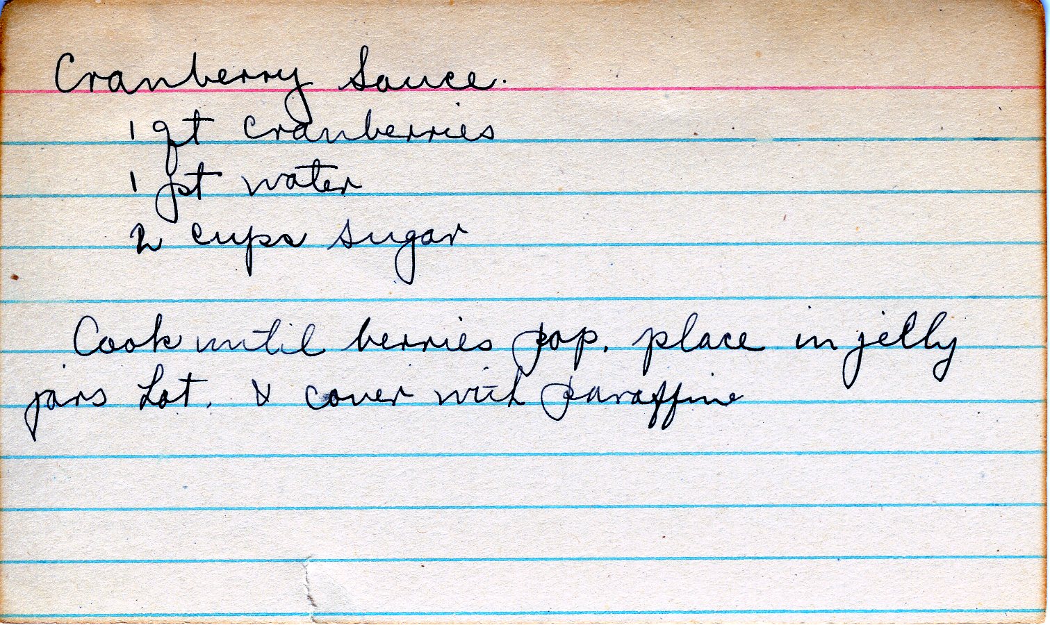 Boil until cranberries pop, place in jelly jars hot & cover with paraffin.