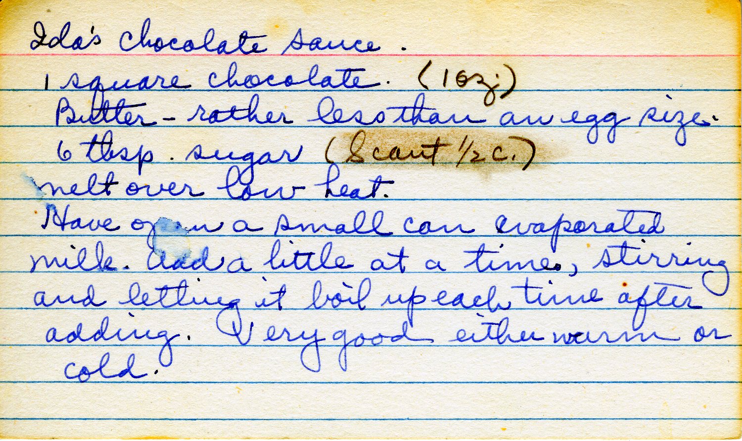 Here we have a second recipe for chocolate sauce. Where the first recipe was pretty much a “throw it together and use it” sauce, this one requires a little bit of time for cooking. It sounds delicious and I love Gram’s notes to herself. They are visual an easy to reconcile. I have no idea who Ida is. On that same note, I asked my mom this morning about Cousin Anne and she has no recollection off hand of who that could have been. She’s going to look at the card because there is some possibility it could be Gram’s mother’s handwriting, in which case Cousin Anne is easier to identify. If you’ve ever spent some time on Ancestry.com (like the Forgotten Old Photos site members who find all sorts of interesting information) then you know it can be confusing at times to sort through the tree and wrap your head around the relationships. Well, Gram’s family had quite a few twists and turns as it turns out – nothing scandalous – just confusing. Maybe one day we will figure out who Cousin Anne is. Until then, enjoy Ida’s chocolate sauce recipe.
