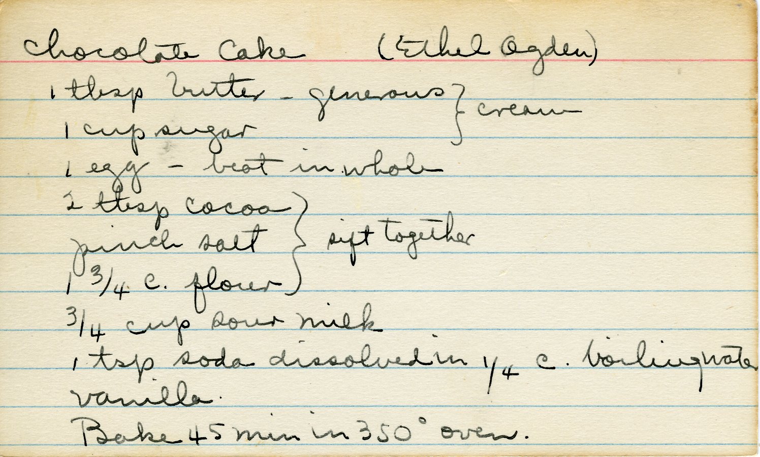 There can never be too many recipes for chocolate cake, in my opinion. Here’s a nice recipe for chocolate cake from Ethel Ogden. I assume this was a friend from church.