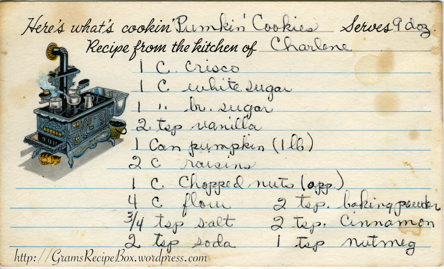 I wonder if this could be made as a scone as well as a cookie. I have no idea who Charlene was, maybe someone who came in to help Gram out in her later years, or maybe someone she knew from church. Pumkin’ – pumpkin of course – cookies look to be sweet, and of course are a chocolate alternative. I was speaking with a friend of mine recently about how modern desserts and treats are so focused on chocolate, but there are so many treats that are good. It makes me wonder how we got to the point in America that dessert is synonymous with chocolate. I’ll keep that in mind the next time I’m on the hook for a dessert. Which by the way I am, for my mom’s birthday in July, and I’m going to be bringing Angel Pie, a non-chocolate dessert. :-)