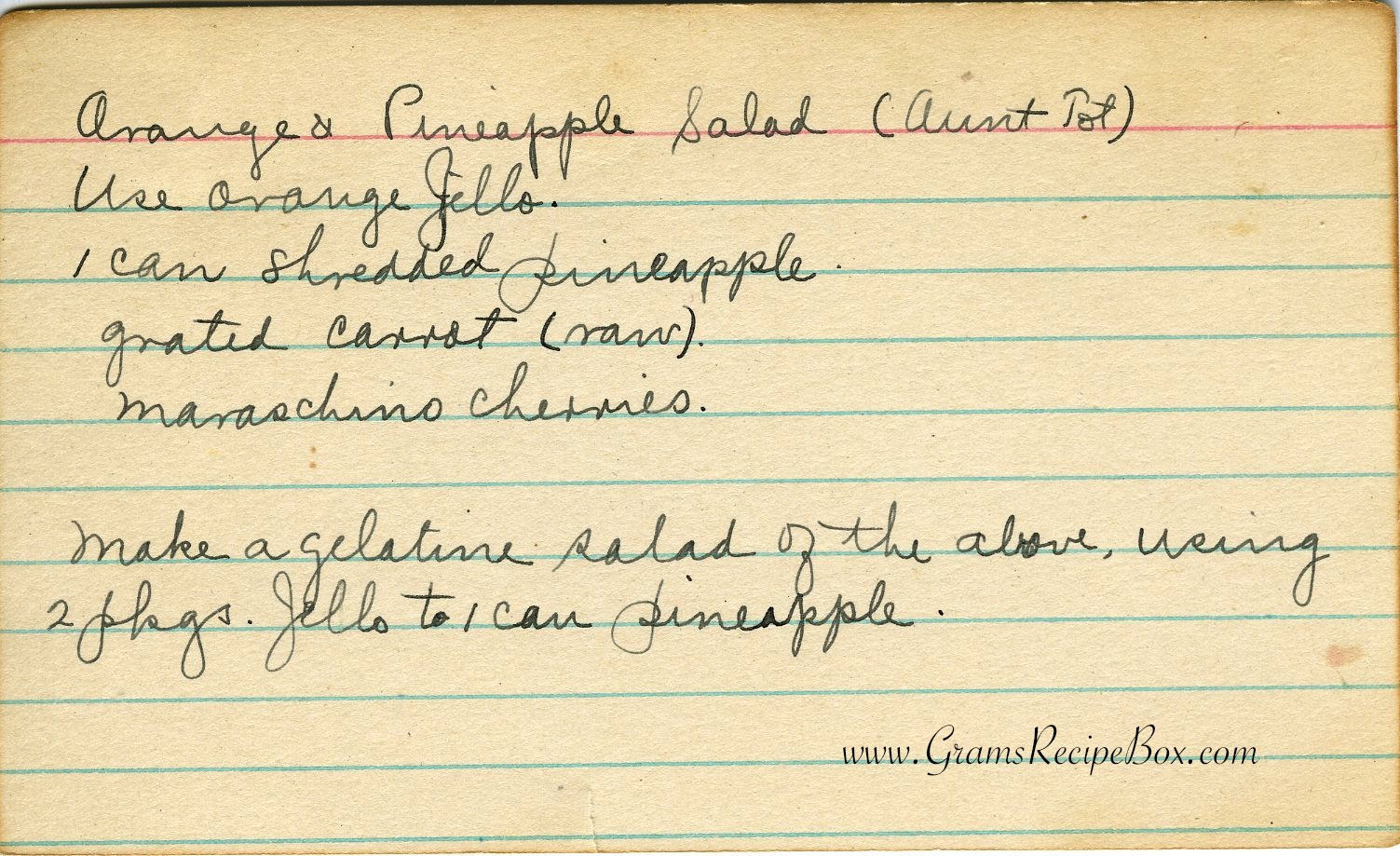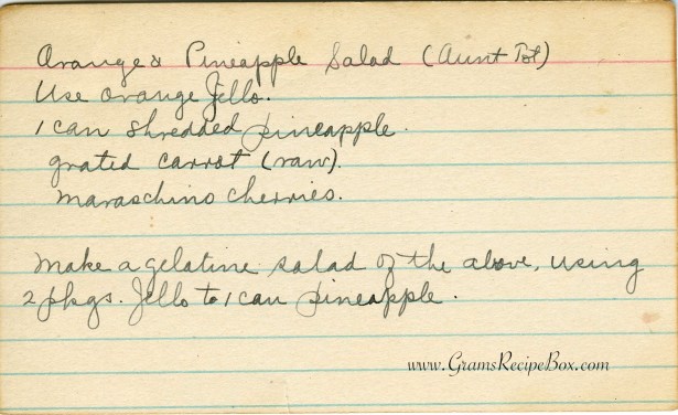 I have no idea who aunt Tot is. Probably a close friend, sort of like Auntie Tara is not related to Melody. When Gram made this salad she used to call it “Golden Glow” salad. Orange & Pineapple Salad sounds dorky.