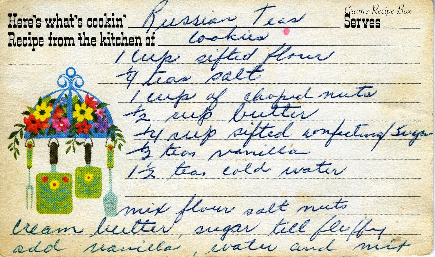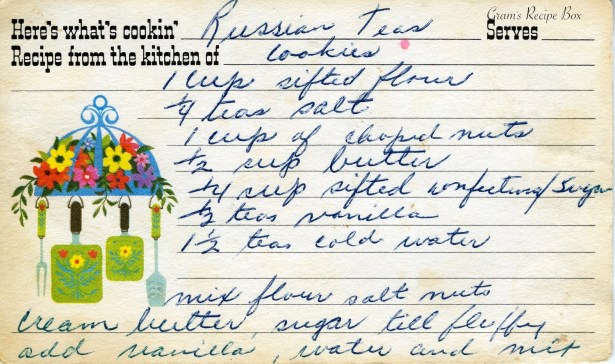 Mmmm, I love these cookies! They are the type you find on a plate at the back of the table at a cocktail party, and the first cookies gone from that plate. They are popular at Christmas time because they look a bit like snowballs. The Russian Tea cookie (or cake) became popular in the 1700s as part of a tea-sharing ceremony, then became popular at weddings and holidays. They are also known as butterball cookies and Mexican Wedding Cakes, although that last synonym is likely from the 1950s when relations between the West and Russia were strained. Interesting.
