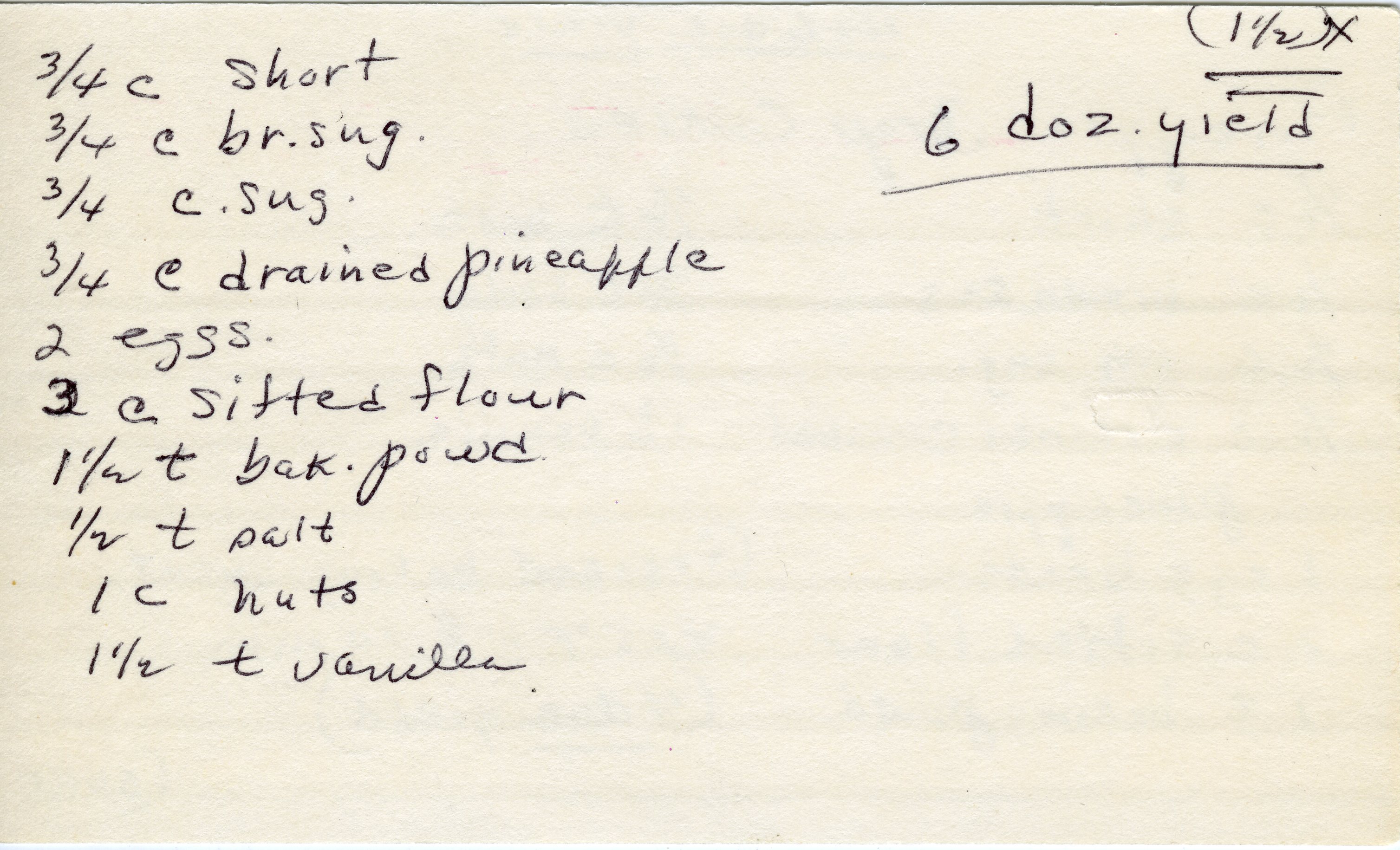 I’m not sure if I like the idea of the pineapple drop cookie or not. It might be a sweet and moist treat, or it could be awful. The front side of the card appears to be the original recipe and the back side is 1 1/2 times the original.