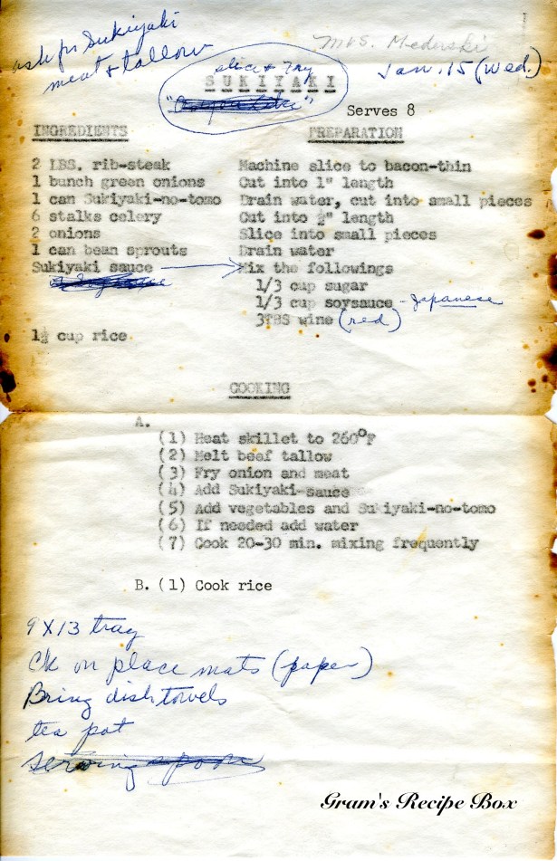 Based on the handwritten notes, this appears to be a recipe handed out for a community function, maybe a church party? The recipe is written out step by step, clearly for people who are unfamiliar with the Japanese nabemono (hot pot) style of cooking. The word sukiyaki translates as suki (spade) and yaki (meat), and old folk tales suggest that the meat was cooked on a hot spade. Hopefully it was clean. Written above the title of this recipe is “slice & fry” which is not the translation of the word. Scratched out is “as you like” which is also not what the word means.