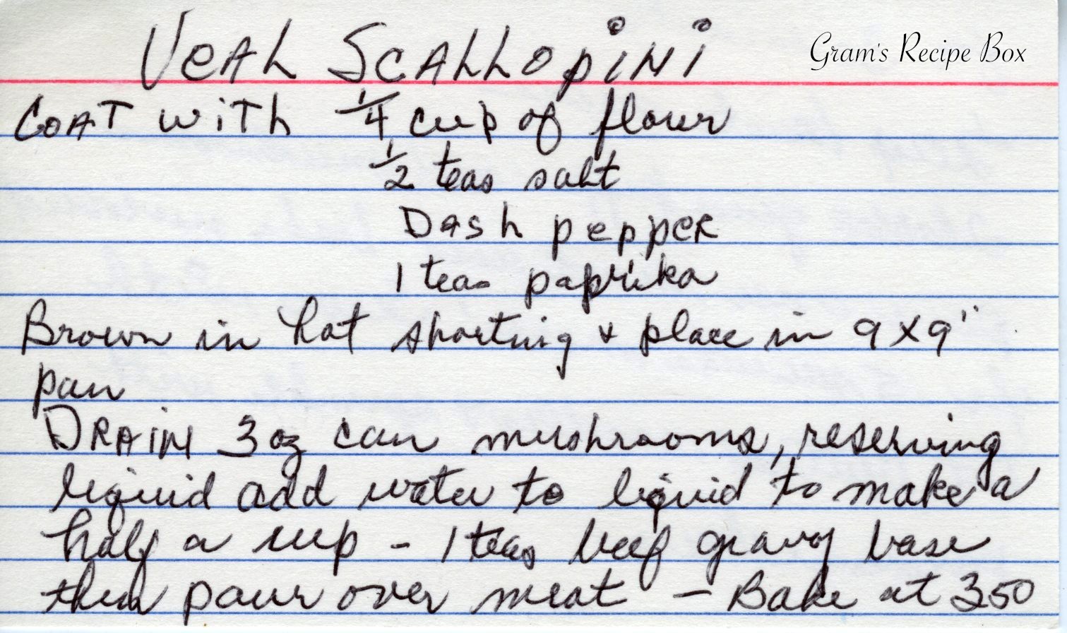 My mom used to make veal scallopini and I remember loving it. However I have no recollection of what it tasted like. These days I have a deep sense of guilt about eating veal, so I don’t. But I will never guilt someone else if they like veal, so please enjoy! I love how this recipe reads like the lady was thinking it out.