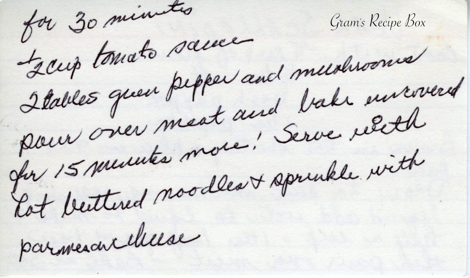 pour over meat and bake uncovered for 15 minutes more! Serve with hot buttered noodles & sprinkle with Parmesan cheese.