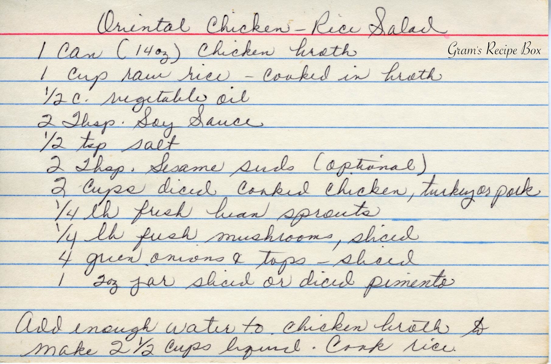 This is a potentially great salad that looks like it could make about 8 servings. You can skip the extra salt and use low sodium soy sauce, plus reduce the amount of oil if you like. The oil, salt, soy sauce and sesame seeds are used to make a kind of a dressing that flavors the rice. In a pinch if you don’t have sesame seeds but you do have sesame oil, use that to provide the the sesame flavor. Serve this at a pot luck or sunny Saturday afternoon lunch.