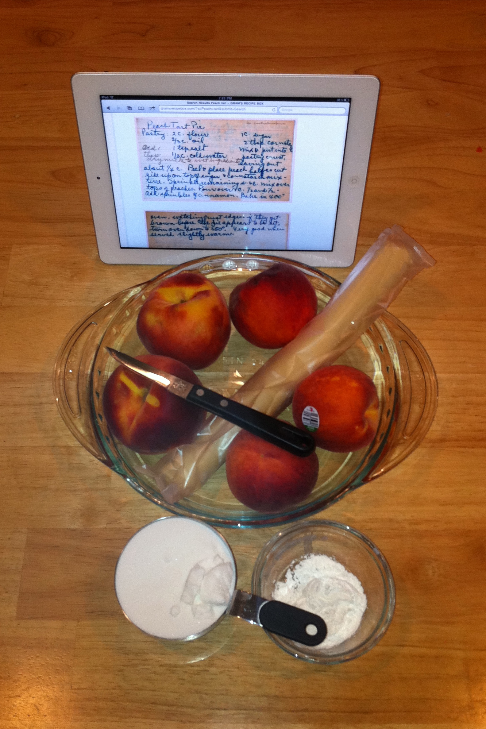 Quite a while ago I posted this recipe for Peach Tart Pie, which had been one of my Gram’s recipes. At the time I commented that it would probably be a dessert that looked impressive but would be very easy. Well, passing through the market the other day I saw peaches…you know what happened next, right? I brought up the recipe (right there in the store) and realized it had very few ingredients: peaches, sugar, cornstarch, pie crust. Now, the real recipe does in fact have the ingredients for a pastry crust, but I freely admit I am all thumbs when it comes to pie crust, so I cheated and picked up a Pillsbury pre made.