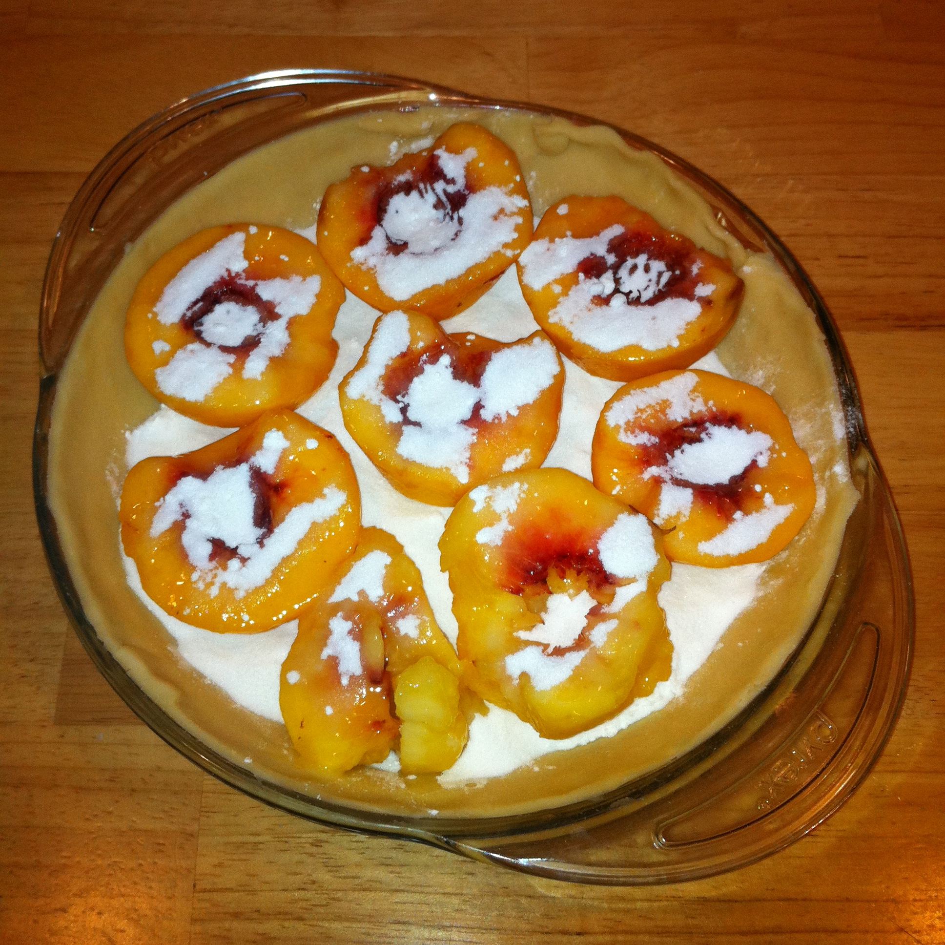 The recipe indicates to save out 1/4 cup of the sugar/cornstarch mix and spread the remaining on the bottom of the pie. Then you place the peach halves cut side up onto the sugar. I was a little uncertain here if I was doing this right, but carried on all the same. There was a spot that looked too open, so I placed a 1/3 of a peach there intending that would be for my young daughter. Next I sprinkled the remaining sugar mixture on top of the peaches, and sprinkled on cinnamon.