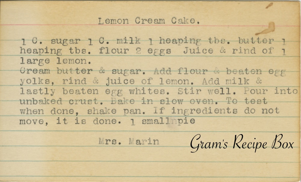 Although this is called lemon cream cake, it is actually a pie. It sounds like a lemon custard pie, which would be nice for a summer evening, chilled and topped with a bit of whipped cream. Delicious! I might have to make this for my mother’s birthday if she will let me. :-) And, although you might already realize this, where the recipe calls for the rind of the lemon, it should be finely grated.