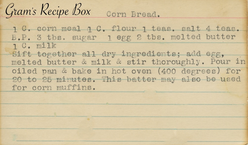 I always remember that about Ma’s handprint on the corn bread every time I make it. I think it was during one of the hard winters when all they had was cornmeal and nothing like butter or molasses to put on it but Pa said it was sweet enough because of Ma’s handprint. Awww!