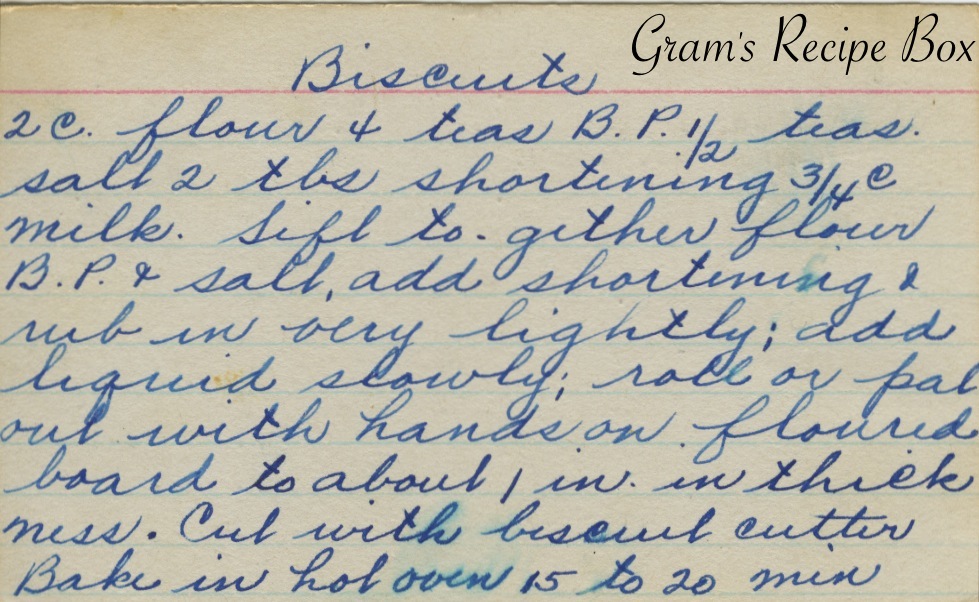 I love making real biscuits. It doesn’t take any longer to make them from scratch than using some ghastly mix. First time I made a delicious chicken and biscuit dinner for my (now) husband, he looked absolutely crestfallen. He really disliked chicken and biscuits and he was trying to figure out how he’d choke down my offering. Surprise! He loved it–not his mother’s burnt on the outside and undercooked on the inside chicken or her famous black-bottom biscuits. You just twist the bottoms off the burned biscuits and they become edible…sort of. My mom always lets me make the biscuits for family get togethers now since mine always turn out taller and fluffier than hers. I don’t know why; she taught me everything I know about biscuits. Guess the torch has been passed.