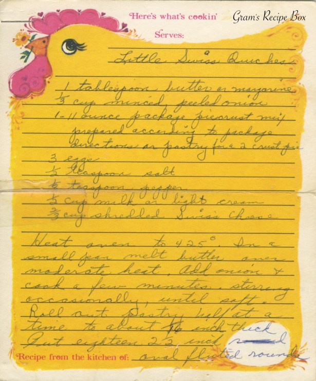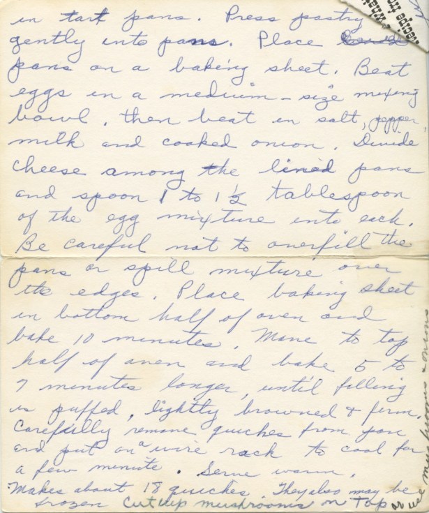 Heat oven to 425. In a small pan melt butter over moderate heat. Add onion & cook a few minutes, stirring occasionally, until soft. Roll out pastry half at a time to about 1/16 inch thick. Put eighteen 2 1/2 inch oval fluted rounds in tart pans. Press pastry gently into pans. Place pans on a baking sheet. Beat eggs in a medium size mixing bowl, then beat in salt, pepper, milk and cooked onion. Divide cheese among the lined pans and spoon 1 to 1 1/2 tablespoon of the egg mixture into each. Be careful not to overfill the pans or spill mixture over the edges. Place baking sheet in bottom half of oven and bake 10 minutes. Move to top half of oven and bake 5 to 7 minutes longer, until filling is puffed, lightly browned & firm. Carefully remove quiches from pan and put on a wire rack to cool for a few minutes. Serve warm. Makes about 18 quiches. They also may be frozen. Cut up mushrooms on top or use mushrooms & onions. Cut up mushrooms and use as fillings also – mix swiss cheese and mushrooms.