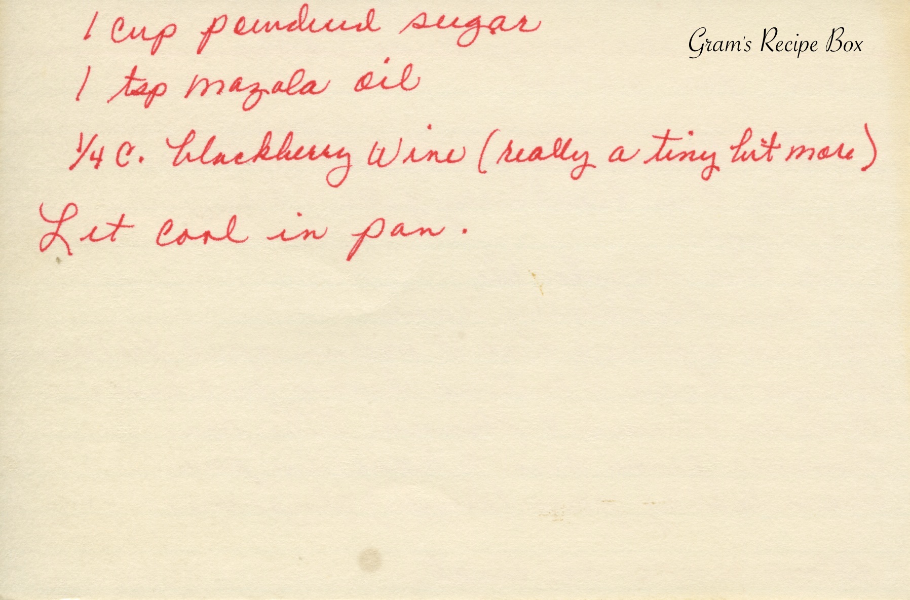 I realize this is entitled Blackberry Wine Cake but every time I look at the handwriting, I see “Whine” haha. However that may be due to me having a five-year-old. :-) I can’t say that I have tried blackberry wine cake, but it sounds like the kind of thing that is going to come back in style, much like red velvet and strawberry cake. This recipe calls for a glaze but I suppose you could ice it too. A real cake connoisseur could even make a blackberry icing.