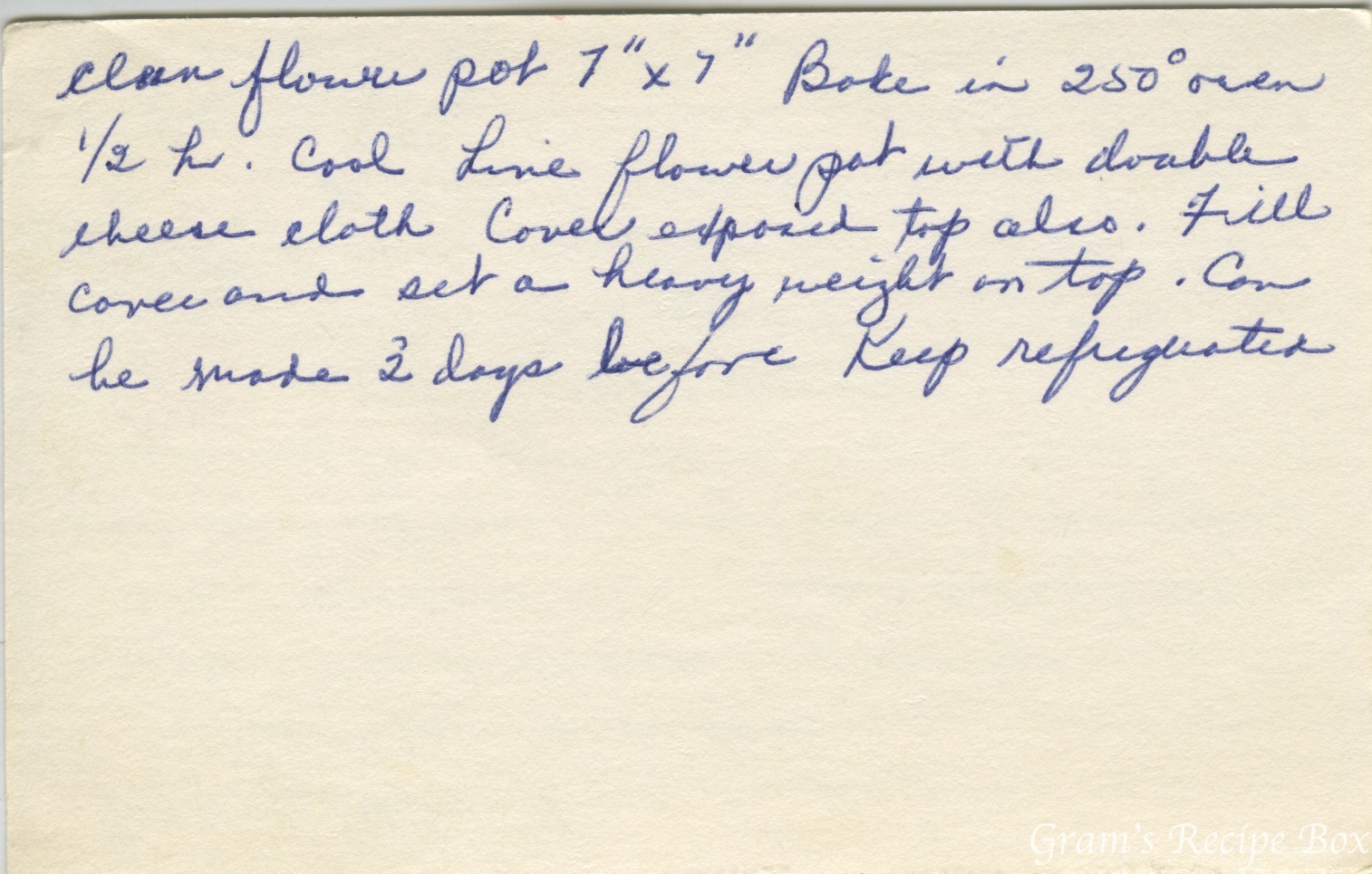 Cook over heat until thick. Cool. Add to cream cheese. Place in cheese cloth to drain for a few hours. Make a mold with a new clean flower pot 7″x7″. Bake in 250 oven 1/2 hour. Cool. Line flower pot with double cheese cloth. Cover exposed top also. Fill, cover and set a heavy weight on top. Can be made 3 days before. Keep refrigerated.