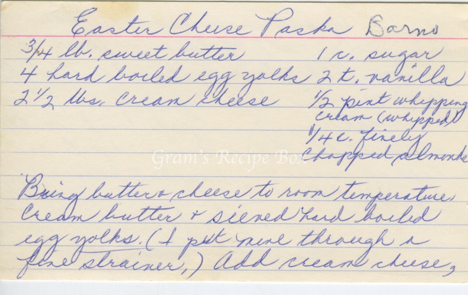 Bring butter & cheese to room temperature. Cream butter & sieved hard boiled egg yolks (I put mine through a fine strainer). Add cream cheese, gradually add sugar and vanilla. Whip cream and fold into first mixture. Add chopped almonds. Candied fruit may be added if desired. Place in mold or flower pot lined with cheesecloth. Place heavy object on top of mold to press out excess liquid. Chill in refrigerator with weight on overnight. Unmold and serve with Kulich or any fruit salad.