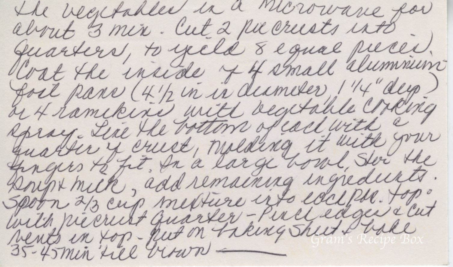 Preheat oven to 375º – defrost the vegetables in a microwave for about 3 min. Cut 2 pie crusts into quarters, to yield 8 equal pieces. Coat the inside of 4 small aluminum foil pans (4 1/2″ in diameter, 1 1/4″ deep) or 4 ramekins with vegetable cooking spray. Line the bottom of all with a quarter of crust, moulding it with your fingers to fit. In a large bowl, stir the soup & milk; add remaining ingredients. Spool 2/3 cup mixture into each pie. Top with piecrust quarter. Pinch edges & cut vents in top. Put on baking sheet & bake 35-45 min till brown.