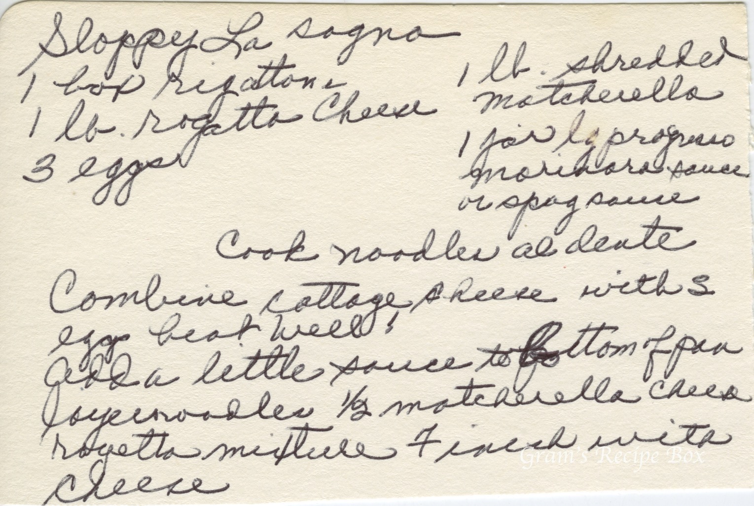 I recently shared with you a recipe called Sloppy Lasagna – which sounds really yummy and easy. This particular card appears to be virtually identical in ingredients and method, so the cook could have forgotten that she wrote it twice, or wrote out one to share and then forgot to give it to someone. I’m going to write the recipe with the correct spellings of the ingredients.