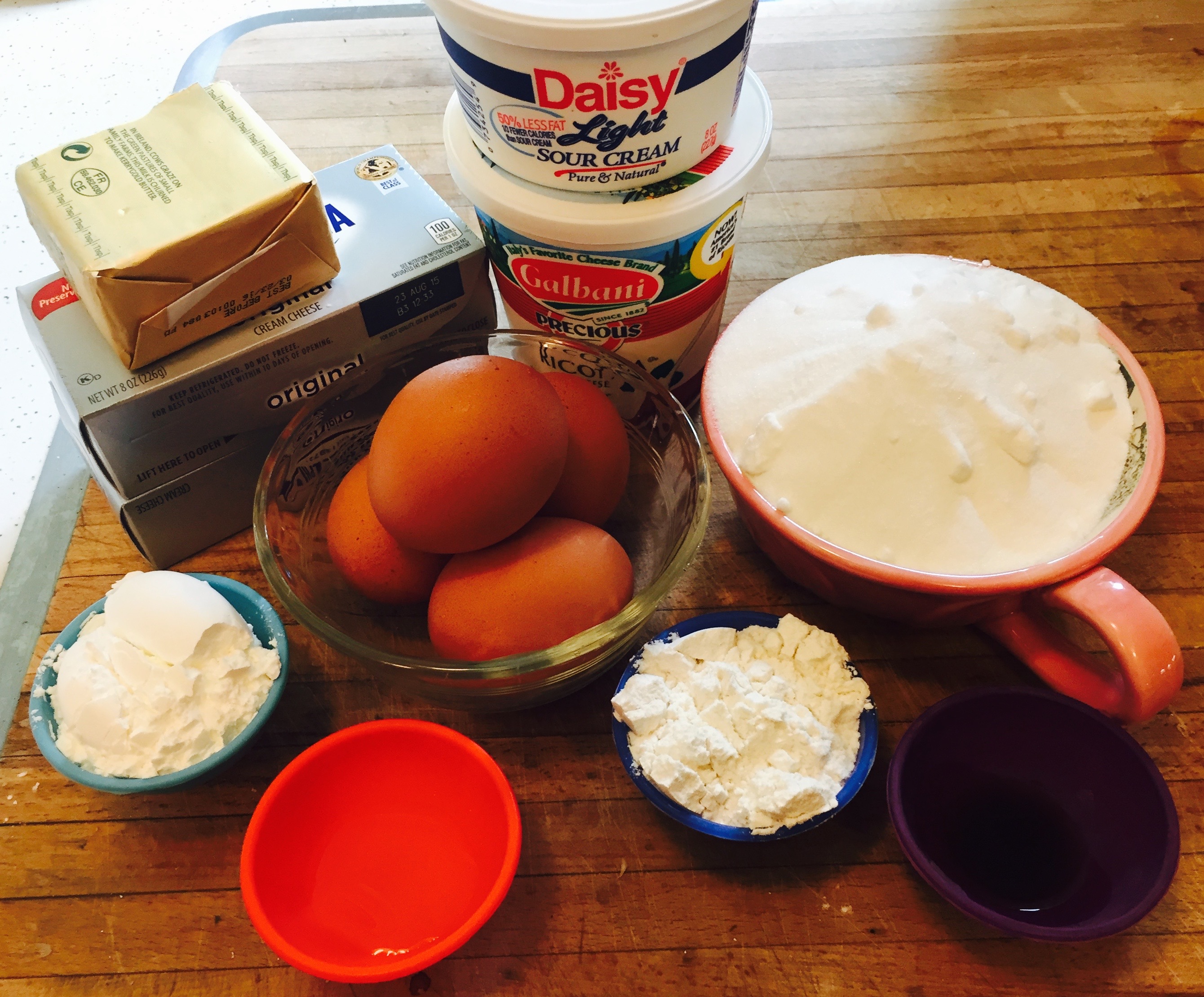 Of note is the fact that Precious ricotta cheese no longer comes in a 16 oz container. They have reduced the volume to 15 oz, but I don’t think this will impact the recipe in any way. I like to set out all my ingredients before I start mixing because then they are all handy and I’m not rushing to find something. I use a KitchenAid Pro stand mixer, which is wonderful when you have to add, then add some more, then add yet some more. No fussing with picking the mixer up, putting it down, back and forth. It’s a stylistic choice, but one I didn’t realize I would ever make until I received my mixer as a gift.