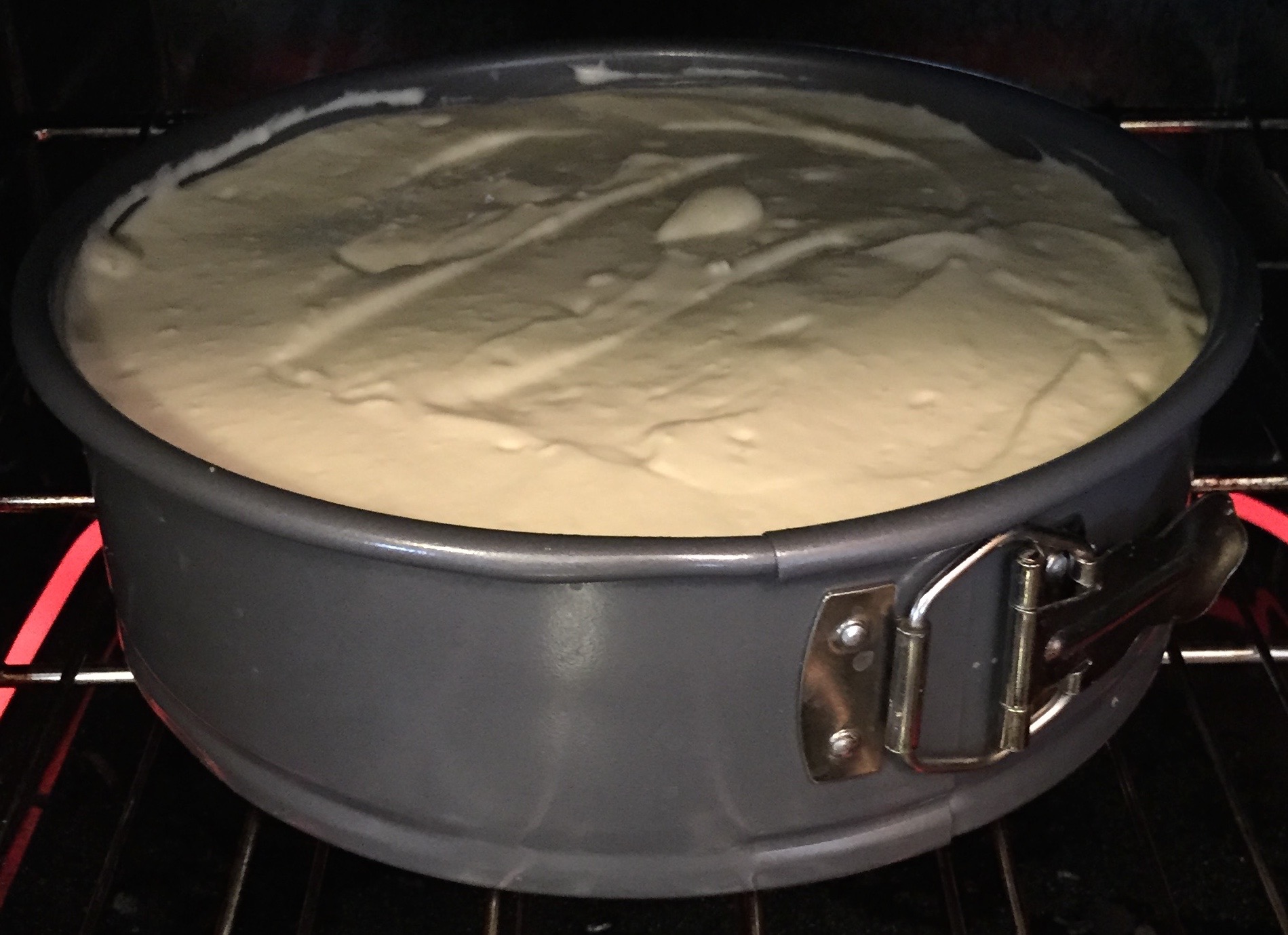 Once everything was combined nicely, I poured it into a spring lock pan. I happened to cut a piece of parchment paper to fit the bottom of the pan because I had heard of someone else doing that. It isn’t required and I honestly don’t really know if it made any difference. Also, the recipe indicates the pan should not be greased and I had greased mine and poured in the mixture before I caught that tidbit. It might be important.