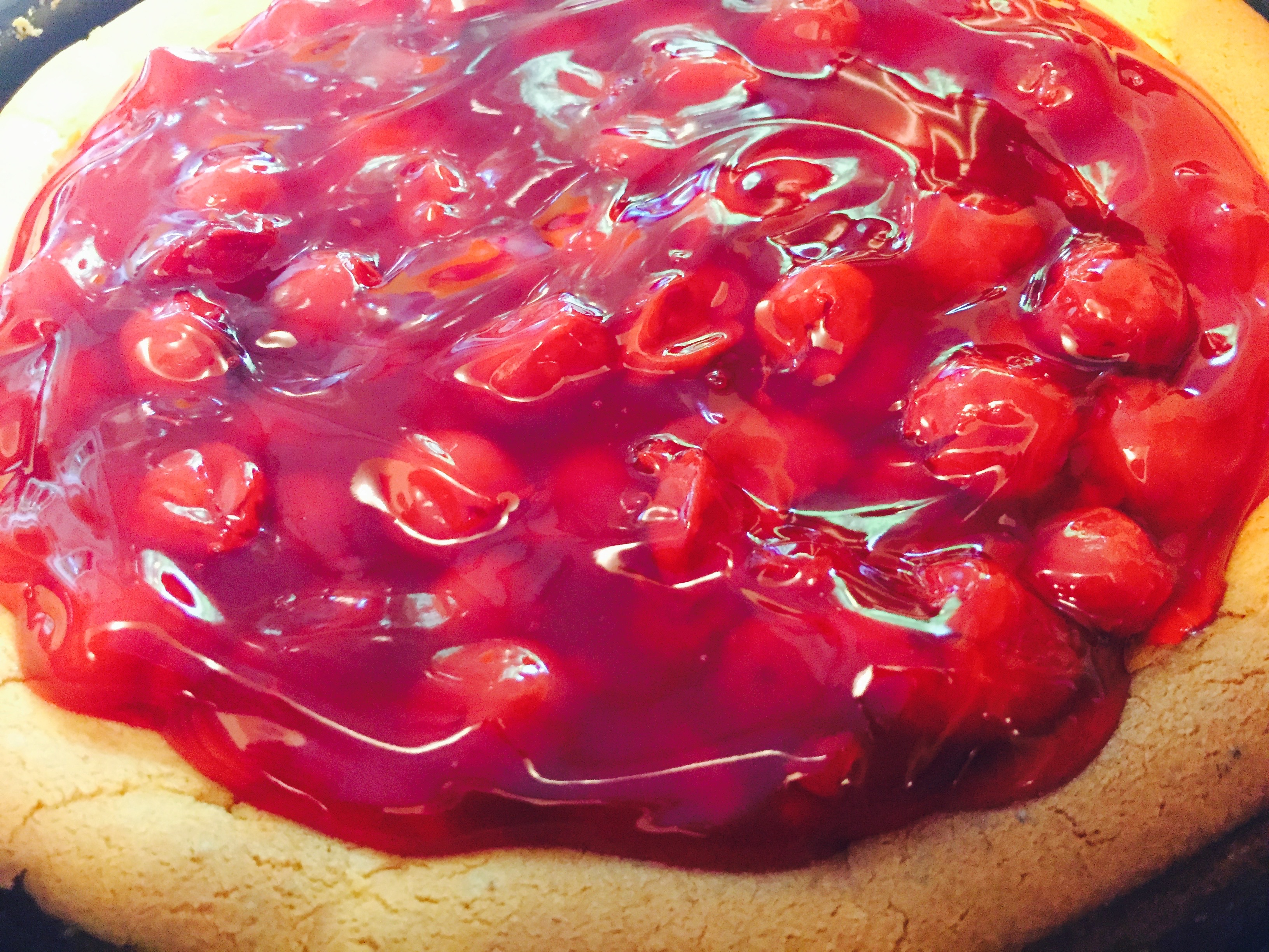 The center fell a smidge, but that made a nice reservoir for the cherry topping. Back when I originally posted this recipe, I suggested I’d probably use cherry topping and not strawberry. Having forgotten all about that off hand remark, I was tickled to see that after I had purchased all the ingredients. You can see here that the top edges are a bit browned. They also fell away from the sides of the pan, which is where the greasing might have been a problem. If they were allowed to stick to the sides of the pan, they might not have pulled away so much. But, did it affect the taste? Inquiring minds want to know, I’m sure!