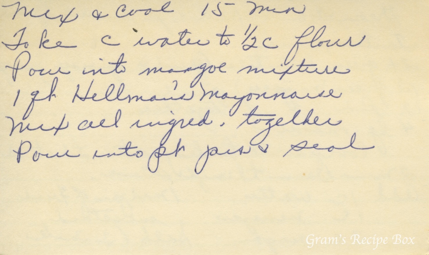 Mix and cool 15 min. Take 1 c water to 1/2 c flour. Pour into mango mixture 1 qt Hellman’s mayonnaise. Mix all ingredients together, pour into pint jars & seal.