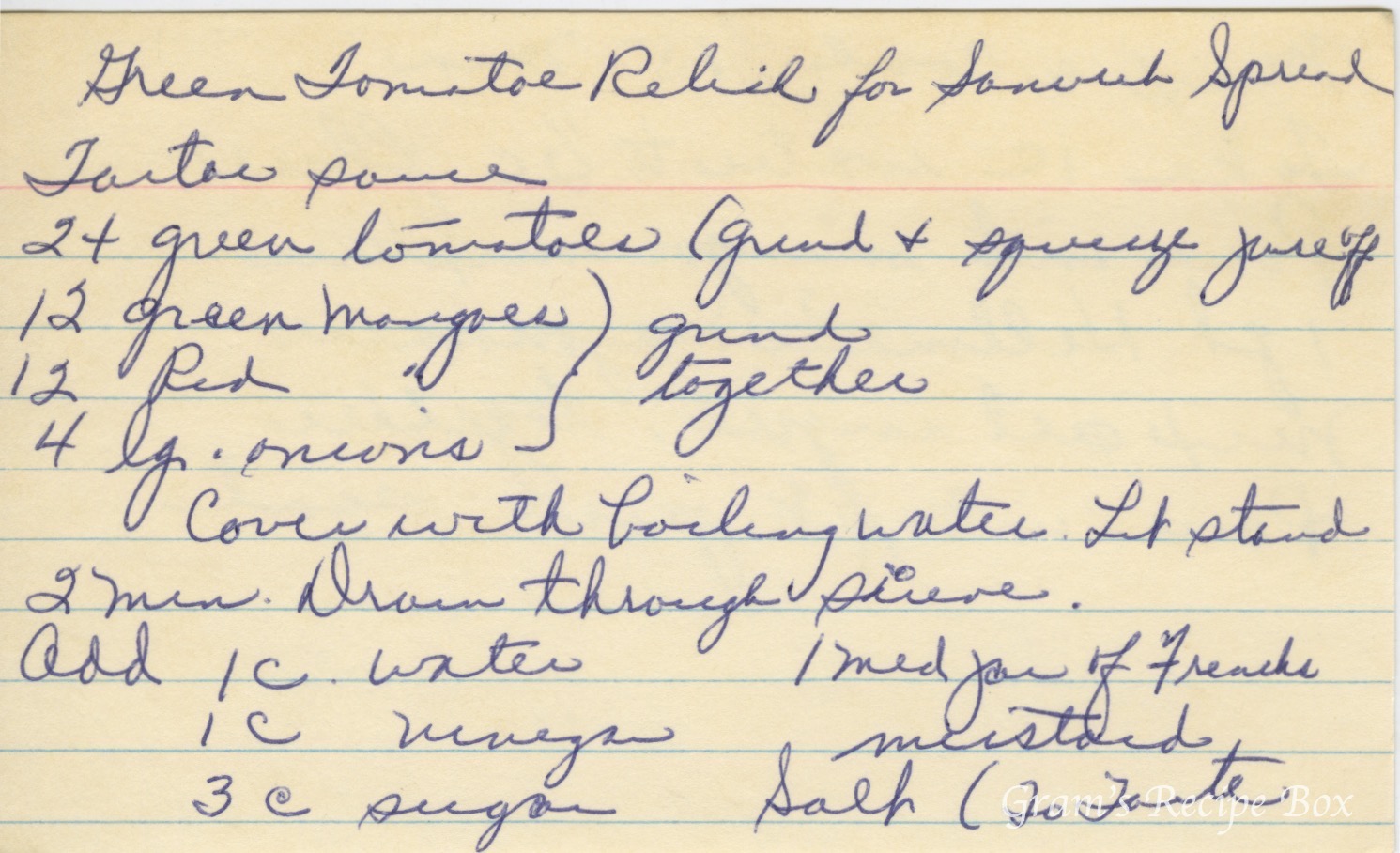 I haven’t tried green tomatoes in any form, mostly because I don’t like tomatoes to start with. Weirdly, I like catsup, salsa, spaghetti sauce, etc., just not fresh, raw tomatoes. This is also another recipe using mangoes. I wonder if the lady who wrote these had a mango tree.