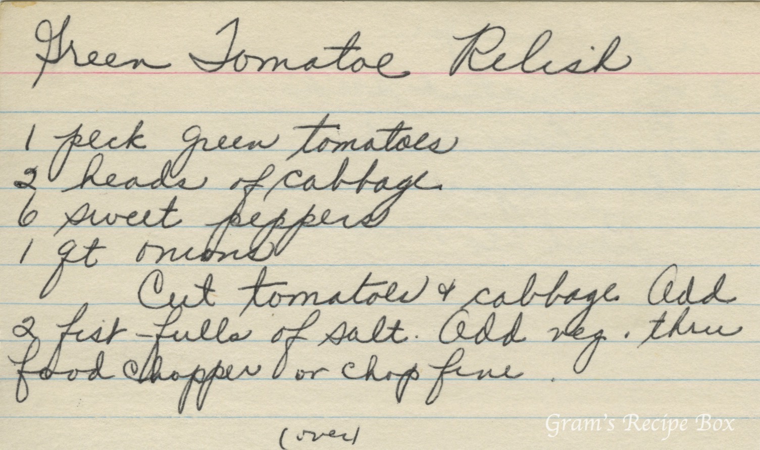 Should you have too many tomatoes in your yard, as we do right now, you could pick them early and make this relish. I’m always reminded of the days of backyard gardens and neighborhood gardens, which are not as common these days as they were even 20 years ago. People seem to have forgotten how to grow their own food since we have the convenience of impressive produce sections at the local market. Particularly where I live, the yards are not quite big enough to grow much, and the prevalence of swimming pools precludes a kitchen garden many times. Hopefully where you live, you are able to enjoy a thriving garden full of fresh produce!