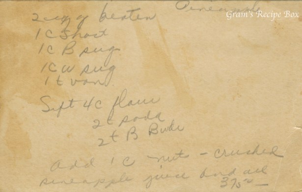 This particular recipe is not for an upside down cake however, it is for a blended pineapple cake. This type of cake might have been iced with a light vanilla buttercream icing, or even a cream cheese icing, depending on your preference. You could also top it with the traditional cherries, sliced almonds, or a combination of both. The timing for baking isn’t on here, so I looked at several recipes for a guide. Start at 30 minutes checking with a toothpick but don’t go beyond 50 minutes.
