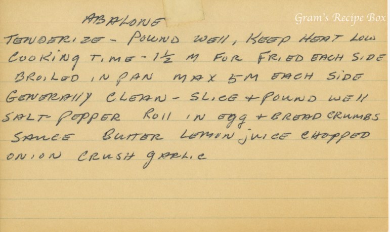 Should you come by some abalone meat and would like to cook it, this is a simple recipe without much elaboration. Keep in mind that the abalone meat is muscular like a clam, so the need to tenderize it is an important step. Sorry there isn’t more to this. However, cleaning the abalone may be necessary depending on its source. I’m not sure how farmed abalone arrives in the store, but wild will have a slick coating and need to be cleaned well. You may want to look here to see some step by step cleaning instructions with pictures.