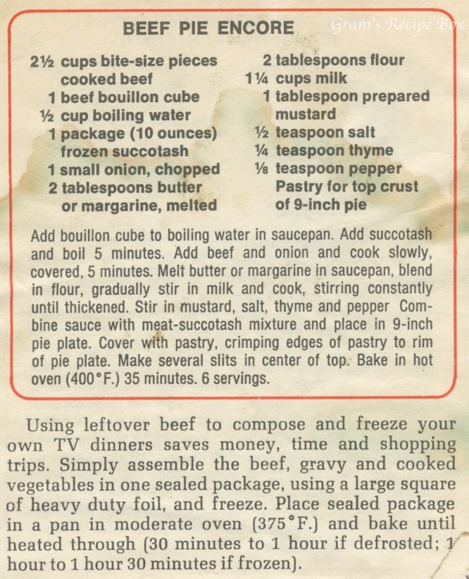 The recipe above is called Beef Pie Encore, but really it should be “Home made TV dinner.” I can remember when TV dinners came in the foil tray, and as an experiment my mom saved a few and made our own TV dinners. It must not have been a tremendous success because we stopped doing it pretty quickly. However, it is no different from some of the “meals in minutes” dinners and premade dinner kits that are on the market today. Frugality gets a new name every few generations, and these days we call it a life hack. Really, it’s just creative use of leftovers, hah.