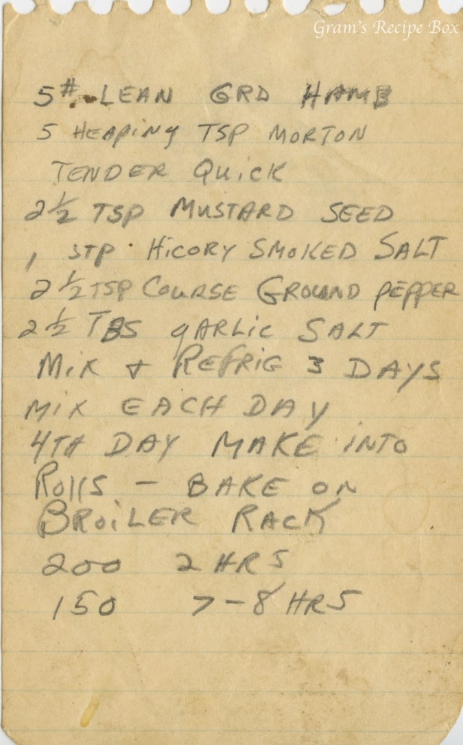 Although this little slip out of a spiral notebook doesn’t have a name, I’m calling it a Smoked Sausage Roll because it seems like a summer sausage recipe, along with the addition of hickory smoked salt. The Morton’s Tender Quick is a curing salt intended for curing meats and game. Click over to the website to find a store that sells it. I haven’t seen it locally, but I suspect that has to do more with our urbanization than anything else. Not a lot of hunters here. Also, it contains nitrates, so be aware of that as relates to any health concerns. I haven’t made a smoked sausage myself. It honestly seems like a simple process. Have you made one? Let us know how it went!