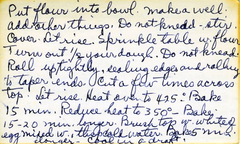 Put flour in a bowl. Make a well, add other things. Do not knead. Stir. Cover. Let rise. Sprinkle table with flour. Turn out 1/2 your dough. Do not knead. Roll up tightly, sealing edges and rolling to taper ends. Cut a few times across top. Let rise. Heat oven to 425º. Bake 15 minutes. Reduce heat to 350º – bake 15-20 min longer. Brush top with white of egg mixed with 1 tbsp cold water. Bake 5 min longer. Cool in a draft.