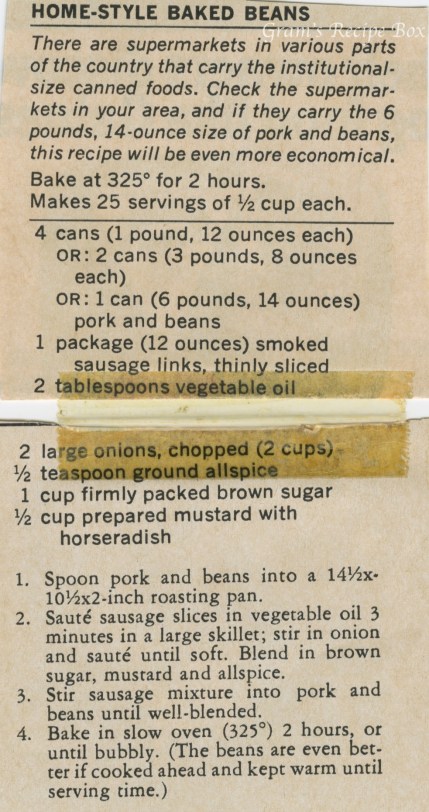 This recipe isn’t completely “from scratch” because it uses prepared beans, but still, this could be yummy for a barbecue or other large gathering. Because can your family eat 6 pounds of beans? Mine can’t. And, imagine the flatulence, oh my. Also, if you have a Costco or other wholesale type store available to you, that is where you should look for your institutional sized cans of beans. I believe the sausages called for here might be the kielbasa type, but if you know different please let us know.