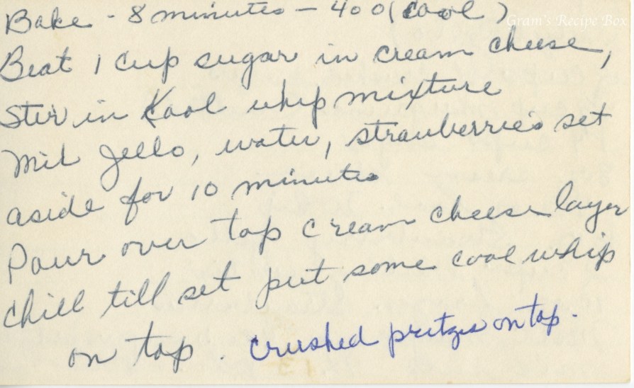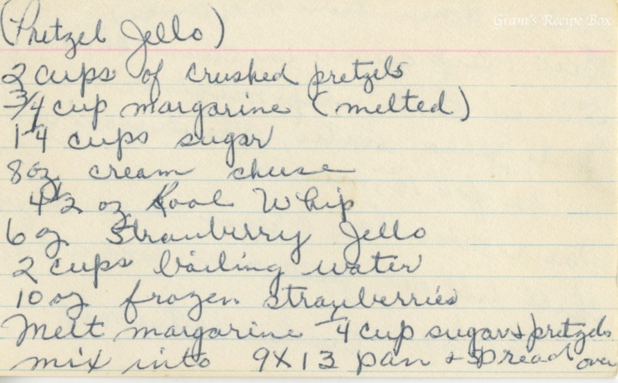 These two recipe cards appear to have the same recipe for Pretzel Jello. It sounds like a dessert dish made of strawberry jello, cream cheese, Cool Whip, and pretzels. I don’t believe I have eaten this, but I am 100% positive it has been served at church socials and family potlucks nationwide!