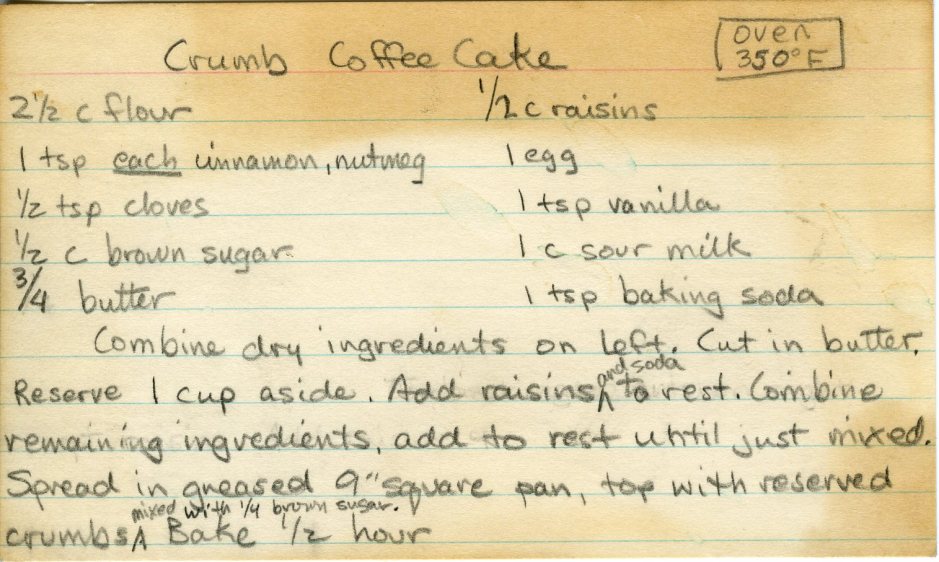 Combine dry ingredients on left (flour, cinnamon, nutmeg, cloves, brown sugar). Cut in butter. Reserve 1 cup aside. Add raisins and soda to rest. Combine remaining ingredients, add to rest until just mixed. Spread in greased 9″ square pan, top with reserved crumbs mixed with 1/4 brown sugar. Bake 1/2 hour. 350 oven.