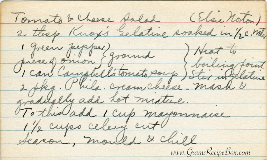 Today’s offering is what would be called a Jello salad or gelatin salad. These are not my favorite dishes, but in general I don’t love jello or jellied things. Other people will likely enjoy it, so I’m not judging. I posted one of Gram’s recipes for a similar salad early in the days of this site. A site reader back on my previous post explained that Tomato Aspic similar to the recipe above is very popular in the South of the US and it is served for all holidays and events. Traditionally, Aspic is a jellied dish that includes meat, vegetables, even eggs, and is served to be visually pleasing as well as taste good. These dishes go back hundreds of years, with the earliest recipe for a meat aspic recorded in the 1300s! As I understand it, the jelly added moisture to meats and fishes, making them more pleasing to consume. They are found in kitchen across the globe with regional variations. Jellied salads and aspics had a resurgence in 1950s America, and while I’ve had my share of the sweetened types, I haven’t tried a savory one. Have you had this or something similar? Tell us what it’s like in the comments.