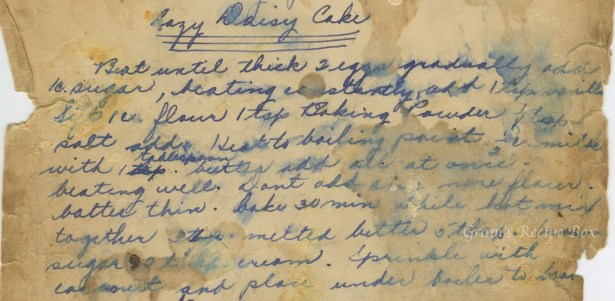 Beat until thick 2 eggs gradually add 1 c sugar, beating it stoutly (not sure of this word), add 1 tsp vanilla. Sift 1 c flour 1 tsp baking powder 1/4 tsp salt, add. Heat to boiling point 1/2 c milk with 1 tablespoon butter, add all at once, beating well. Don’t add any more flour, batter thin. Bake 30 minutes. While hot mix together 3 tbsp melted butter 5 tbsp brown sugar 2 tbsp (unsure) cream. Sprinkle with coconut and place under broiler to brown.
