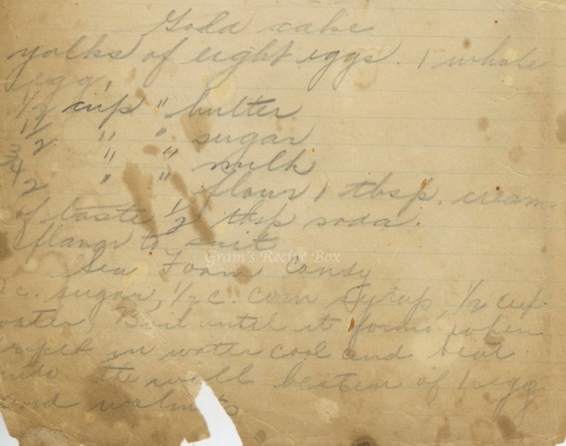 There’s also a bonus recipe for Sea Foam Candy. I originally thought the page had the method to make Gold Cake, but after scanning I realized it was in fact another recipe. Because I’m handling these pages as little as possible, I was moving quickly in the scanning process, your gain, I suppose. :-) There are also recipes out there for various versions of Sea Foam Candy, but most of them include vinegar, no egg, and chocolate for dipping.