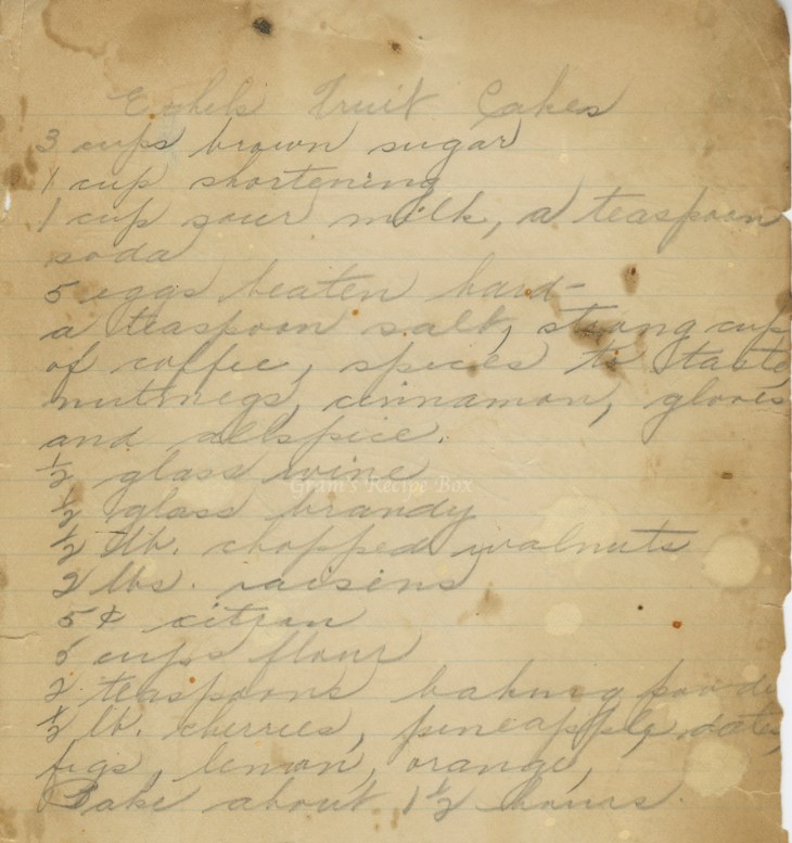 For the best fruit cakes you need to make them around Thanksgiving (4th Thursday of November for everyone else), and then baste them well with alcohol of some kind. I have always made my great-grandmother’s fruit cake recipe, but the Jackson’s Vanilla Wafer recipe is a very popular one on this site. Add to the rolls of fruit cake recipes, this one from Irene Bartz’s friend Ethel. This recipe looks like it will make several cakes, as was tradition. Make several fruit cakes and give them as gifts, serve at holiday gatherings, etc. I suggest reading a couple of the other recipes for reference before making this one because there is no method here.