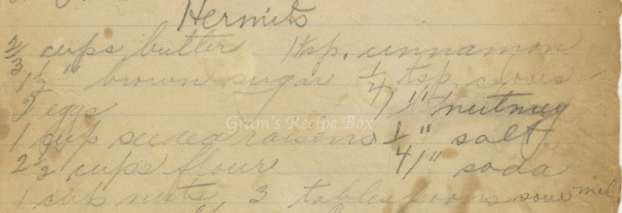 Here’s another interesting cookie with a fascinating history. I had never heard of Hermits before, but Mr. Google tells me there is a long and storied mystery & history behind them. Hermits may have been popularized in the American Colonial period as a bar cake that would last for a long time. They have the sugar and spice of fruit cake, which of course was one of Martha Washington’s famous “great cakes,” and so, the durability to be stored with little negative effects, apparently. The Deseret News once speculated that they are much older, and the name Hermits came from the ancient hermitages (monasteries) and that the ingredients would have been commonly available. They also suggested that the cookies (called tea cakes or just cakes) would have been made last, with whatever was left over after the day’s meals had been prepared. Bon Apetit magazine and many other online sources cite the second half of the 19th century as the time when Hermits became much more popular. Recipes were published in community cookbooks all the way to the famous Fannie Farmer. The treat was popular due to not needing refrigeration and being quite portable. Their popularity waned in the mid 20th century. Perhaps we can fashion a resurgence, friends?