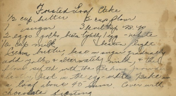 You had me at cake. This is a fairly straight forward cake that is made in what we think of today as a bread pan (or meatloaf pan). In the days of home bread making, kitchens had numerous types and shapes of pans. Long skinny ones, jelly roll pans, spring pans, bundt pans, multiple loaf pans, shaped pans… A woman needed these various shapes and sizes for each of the types of bread she planned to make. A loaf pan would have been common right along side the jelly roll pans – today we think of jelly roll pans as cookie sheets. They used to be used to make a thin sponge cake that was spread with jelly and icing, then tightly rolled in a spiral. Sounds lovely. This particular cake, baked in a loaf pan, would come out looking like a pound cake I suspect.