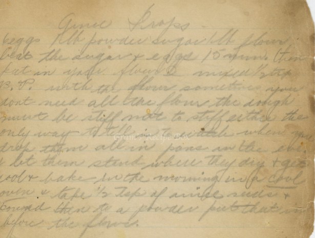 Beat the sugar & eggs 15 minutes, then put in your flour mixed 1/2 tsp B. P. with the flour. Sometimes you don’t need all the flour, the dough must be stiff not too stiff with the only way to tell is to watch when you drop them all in pans in the evening. Let them stand where they dry & get cool, and bake in the morning in a cool oven & take 1/2 tsp of anise seeds and pound them to a powder, put that in before the flour.