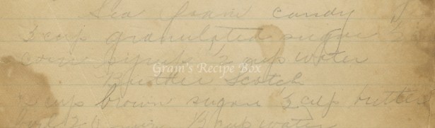 I kept thinking this was a duplicate, because I remember some discussion about Sea Foam Candy recently. I was right, but this isn’t an actual duplicate either. Like numerous recipes I have, this is a variation of another candy of the same name. The previous recipe for Sea Foam Candy called for more sugar. I have no idea if that makes any difference. Much like the previous post, I was fooled by the faded pencil and old fashioned writing when scanning this and I thought “butterscotch” was part of the Sea Foam Candy recipe. It makes sense to me, since butterscotch is a type of flavoring. BUT, it is a separate recipe!