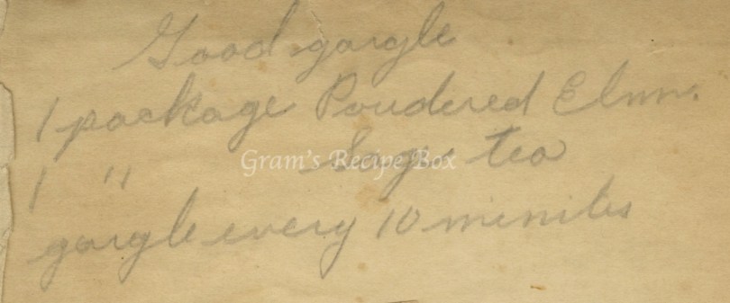 It sounds a little bit like something your grandmother might say when frustrated. “Oh good gargle!” :-) Here’s another home health remedy, presumably for a sore throat. The powdered elm I believe would be powdered slippery elm bark. This is known for its treatment of coughs, sore throat, colic, diarrhea, constipation, and many other ailments. Seek guidance from your physician before using this recipe – I am making no medical claims here.