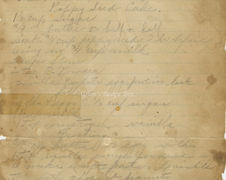 This is a bit of a wreck. At first I thought it was parts of different recipes, but it really seems to go together on the page. But, the last instruction is to top with chopped peanuts, and that just doesn’t seem like a topping for poppy seed cake. Tastes change, I guess. My notes are in italics.