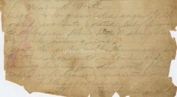 Another damaged page, and the pencil is fading and difficult to read. The walnut torte could be from Ukraine or Hungary, USA or Austria. They are typically layered, 3-6 layers, separated with whipped cream or flavored whipped cream (like mocha). The topping should be light and lovely, and depending on your preference can dribble over the edge or be cleanly iced. This particular recipe does use baking powder as leavening in place of whipped egg whites, whereas traditional tortes would use the egg whites and little to no baking powder. You can see the filling was there once upon a time, but has been lost now. You could easily make a whipped cream filling that would be lovely.